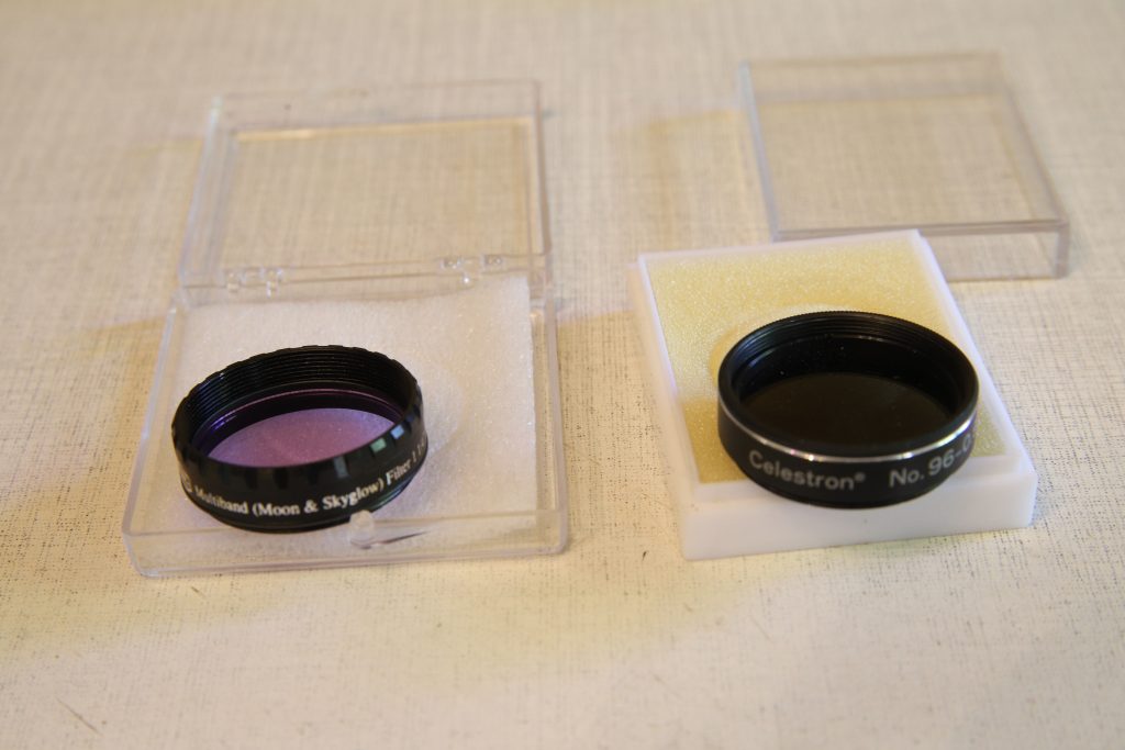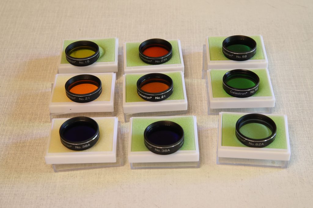 Celestron n° 96 (moonfilter, 0,3 density), n° 15 (yellow), n° 21 (orange, 2 filters available), n* 23A (light red), n° 38A (blue, 2 filters available), n° 56 (light green), n° 58 (green), n° 82A (light blue)