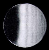 Het Foucault-beeld van een goede sferische spiegel, met het mes iets vóór het krommingsmiddelpunt. De spiegel wordt donker van rechts naar links. Heel verwarrend voor beginners zijn de verticale lijnen op het verlichte spiegeldeel: het zijn interferentie-franjes veroorzaakt door de snee van het mes.