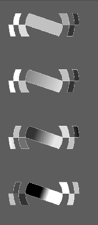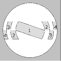 identiek hetzelfde: we zoeken een (longitudinale) plaats voor het mes waar zowel het linker- als het rechtervenster van het masker tegelijk donker worden: dit is dan het krommingsmiddelpunt voor die zone. Eigenlijk zouden we dan het masker nog eens 90° moeten draaien, om te zien of dit niet alleen geldt voor de linker- en rechterzijde van de bewuste zone, maar ook voor boven- en onderkant ervan. In de praktijk is dit niet nodig, tenzij men heel slordig gewerkt heeft (een dergelijke afwijking heet astigmatisme). Doe nu hetzelfde voor de andere zones, en meet hoeveel het mes naar voor of naar achter moet om voor die zones het krommingsmiddelpunt te vinden.