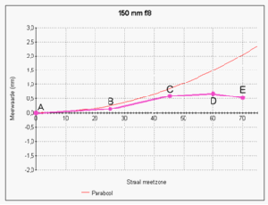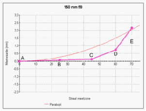 naar achteren verschoven dient te worden om de brandpunten van de verschillende zones te bereiken) te gaan interpreteren, om te zien of we de correcte parabool reeds bereikt hebben. Daarvoor kan je op voorhand de exacte waarden berekenen, en de toegestane afwijking hierop (zie formules in vorige aflevering). Dit kan in tabelvorm weergegeven worden, maar de grafische weergave is naar mijn