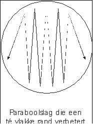 gevoel véél instructiever. Wie over een computer beschikt kan natuurlijk alle gegevens direct elektronisch laten verwerken. Hiervoor is op het Internet voldoende te vinden (surf bvb. eens naar hier of naar deze site). Programma's als "tex" of "foucault" zijn een beetje spartaans uitgevoerd (ze draaien meestal nog onder DOS), maar daardoor kunnen ze ook nog gebruikt worden op een oude PC die eventueel in het atelier komt te staan. Een tussenoplossing bestaat uit het gebruik van een spreadsheet (zoals "Mil_lac.wks"): voer de gegevens van je spiegel in (diameter en beoogde brandpuntsafstand) en je krijgt een mooi grafiekje met de nauwkeurigheidsenveloppe erop. Dan hoef je zelf maar je meetgegevens erop in te tekenen. Correcties: Er zijn eigenlijk drie factoren die de kwaliteit van de spiegel bepalen: - grootschalig: de algemene vorm van de spiegel. Deze is af te leiden uit het overzichtsbeeld uit de Foucault-test, maar vooral ook de cijfergegevens van diezelfde test. Hiermee ziet en berekent men of de spiegel in zijn geheel de juis