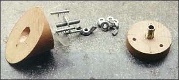 een massieve houten buis (diameter gelijk aan of lichtjes kleiner dan de kleine diameter van de vangspiegel), een dun stukje metalen of kunststof plaat, een stukje holle draadstang of metalen buisje (M8 bvb.), een bout die in de voorgaande past (M6 of M5?) met bijhorende vleugelmoer. Belangrijk is dat deze bout een kop heeft met een schuine onderkant, zodat de houder er lichtjes kan op scharnieren. drie lange boutjes (M4 bvb.) met bijhorende vleugelmoeren. Ook deze hebben een gelijkaardige kop. drie relatief sterke veertjes die passen rond deze boutjes