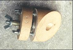 1) Eerst zaagt men een schijfje van de houten buis af, waarin centraal een gat geboord wordt (zodanig dat de holle draadstang of het metalen buisje er in klemt). De draadstang wordt afgezaagd zodat hij er aan de bovenkant ongeveer één cm uitsteekt. 2) Het resterende stuk houten buis wordt zorgvuldig onder een hoek van 45° afgezaagd. Eerst boort men er centraal een gat door (diameter iets dikker dan die van de lange bout, zodat het blokje wat kan "knikken"). Het is echter de bedoeling dat de kop van de bout erin verzonken wordt, dus nadien moet er langs de schuine kant nog eens geboord worden met een boor die dezelfde diameter heeft als deze kop (voorzichtig: niet doorboren). Aangezien het uiteinde van de boor bol is, zal die vorm tamelijk goed overeenkomen met die van de onderkant van de kop van de bout, zodat een soort van "bolgewricht" ontstaat waarop het houten blokje wat kan "knikken". 3) Boor nu drie gaatjes in het eerste houten blokje, op 120° uit elkaar, en zoveel mogelijk naar de rand. Zorg dat de drie boutjes hier vlot in passen zonder te klemmen. 4) Zaag of snij een ronde schijf uit het metalen of kunststoffen plaatje. Daarin komt terug een centrale opening voor de grote bout, en de overeenkomende gaatjes voor de drie boutjes. Met een dikkere boor of een speciale verzinkboor worden deze drie gaten zodanig bewerkt dat de koppen van de bouten er helemaal in wegzinken (belangrijk!) 5) Boor nu aan de zijkant van de eerste houten schijf de overeenkomstige drie gaten. Daarin komen drie lange draadstangen die dienst doen als ophanging, om de houder te bevestigen in de telescoopbuis. Ze moeten dan ook keihard vastzitten, dus gebruik een boor die ietsje (één of een ½ mm) smaller is zodat ze er stevig in klemmen. 6) Assembleer het geheel. De vangspiegel kan er dan op bevestigd worden met enkele klodders siliconenlijm (deze geeft wat mee, zodat geen spanningen kunnen ontstaan) en/of drie metalen latjes waarvan het uiteinde een klein stukje over het spiegeltje geplooid zitten.